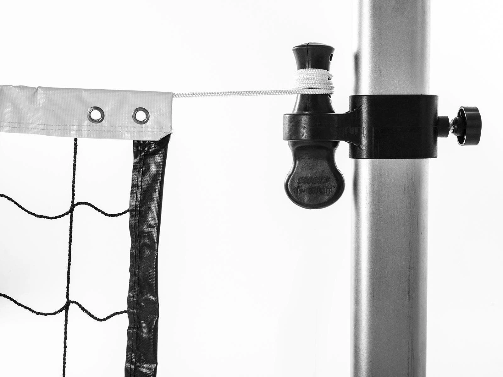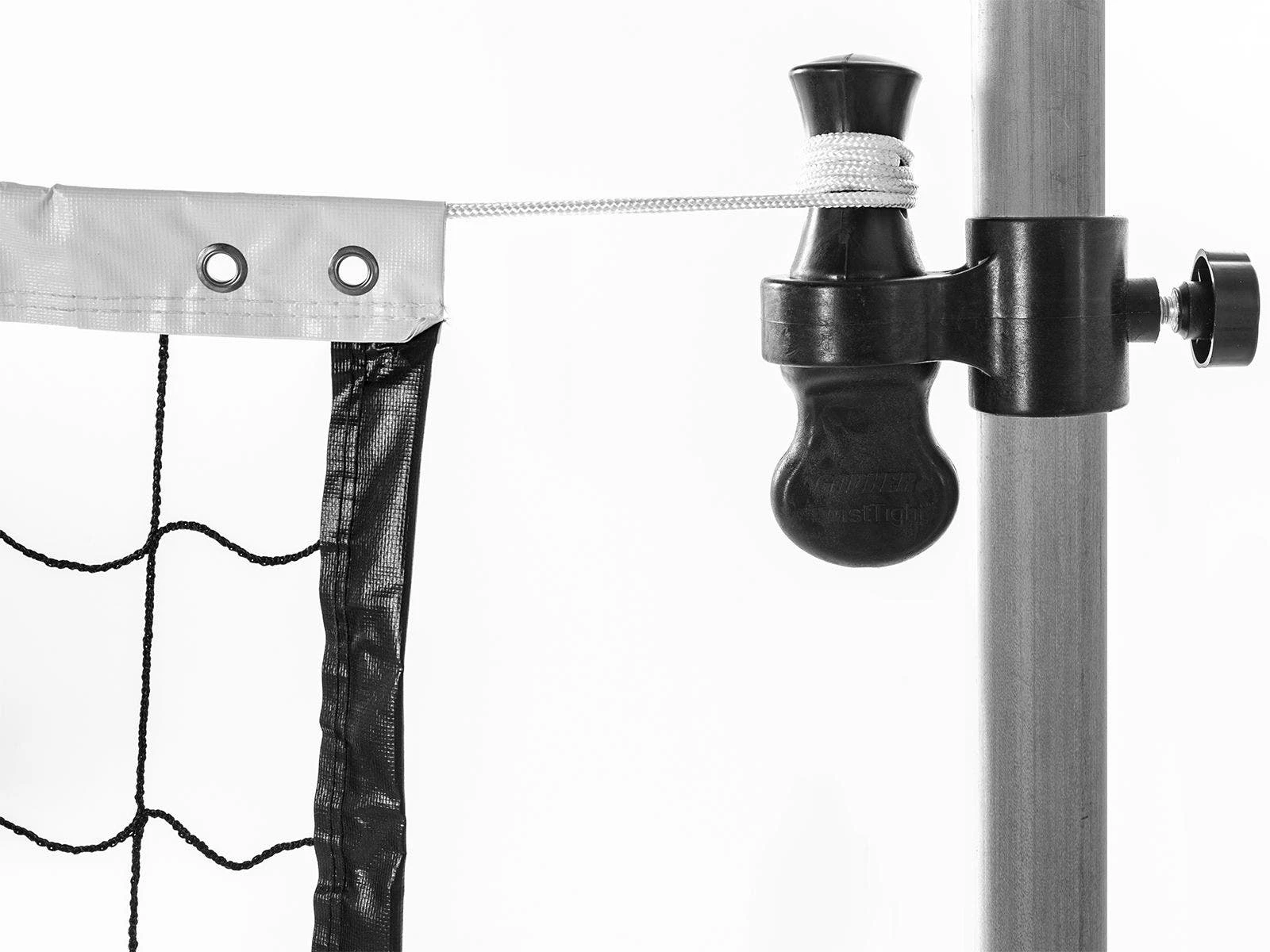 Place the nylon collar at the desired height on each pole and tighten into place. Then slide one end of the top rope on the volleyball net into the hole on one collar and twist the bottom handle to secure the rope. Repeat on the other collar. Twist the collar handle to ratchet the net tight. Simply pull down on the handle to release the net when done.